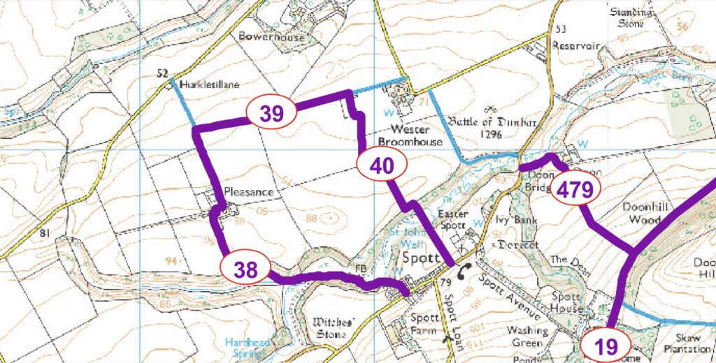 Linking Spott to Wester Broomhouse, footpath 40 completes a circular walk from Spott via Path 39 and 38.